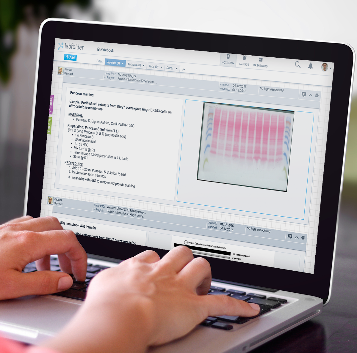Labfolder is an Electronic Laboratory Notebook (ELN), the paperless solution for scientists to their findings and scale their department's research. In technical terms, it's a web-based application to help scientists keep their data centralized while making it collaborative. The specialized format of the ELN allows the scientists to upload and visualize any type of format required in the lab, making it a powerful tool not to miss any detail in research. Among the functionalities developed, the scope includes a self-built WYSIWYG text editor with Latex support, an integration to a table editor with complex formula support, an integrated chemical formula drawer for chemistry purposes, a self-built file upload and visualization mechanism, as well as a self-built microwell plate editor for biology purposes to integrate with lab devices to read well plates.